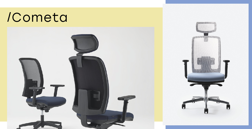 Cometa’s backrest comes in the modern mesh or padded version, offering in the latter case a chair that is compact yet soft and appealing. This solution in particular adapts perfectly to the worker who cannot move around and must spend at least 20 hours a week seated in front of the computer. The chair is in fact able to protect the lower back, an area which is highly sensitive to postural stress.