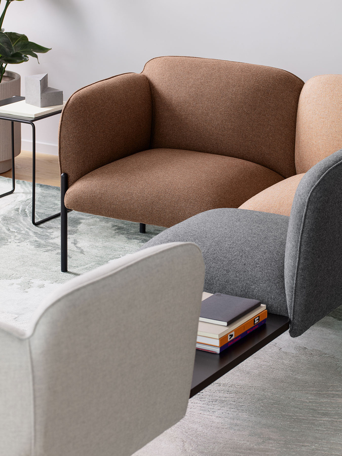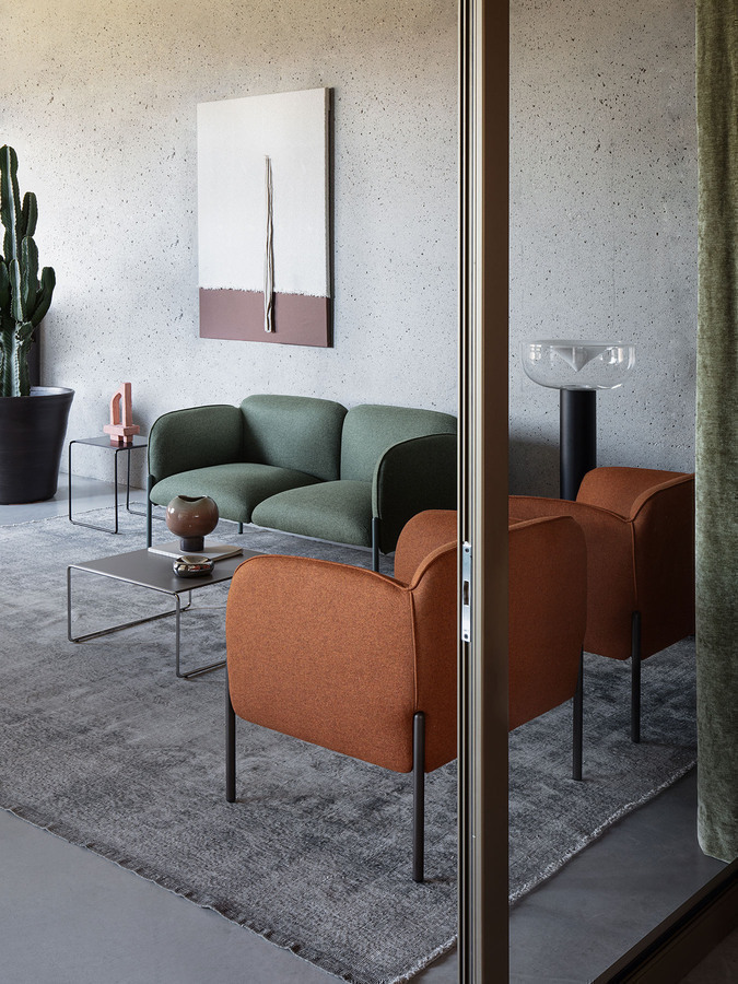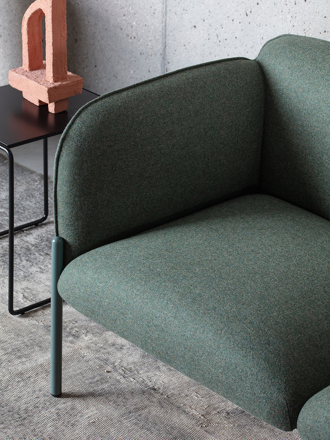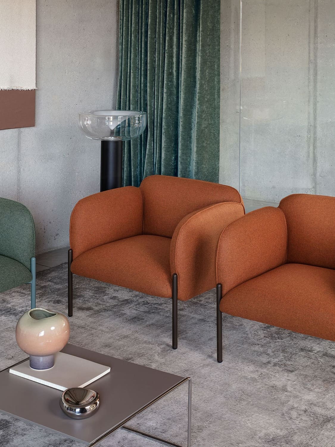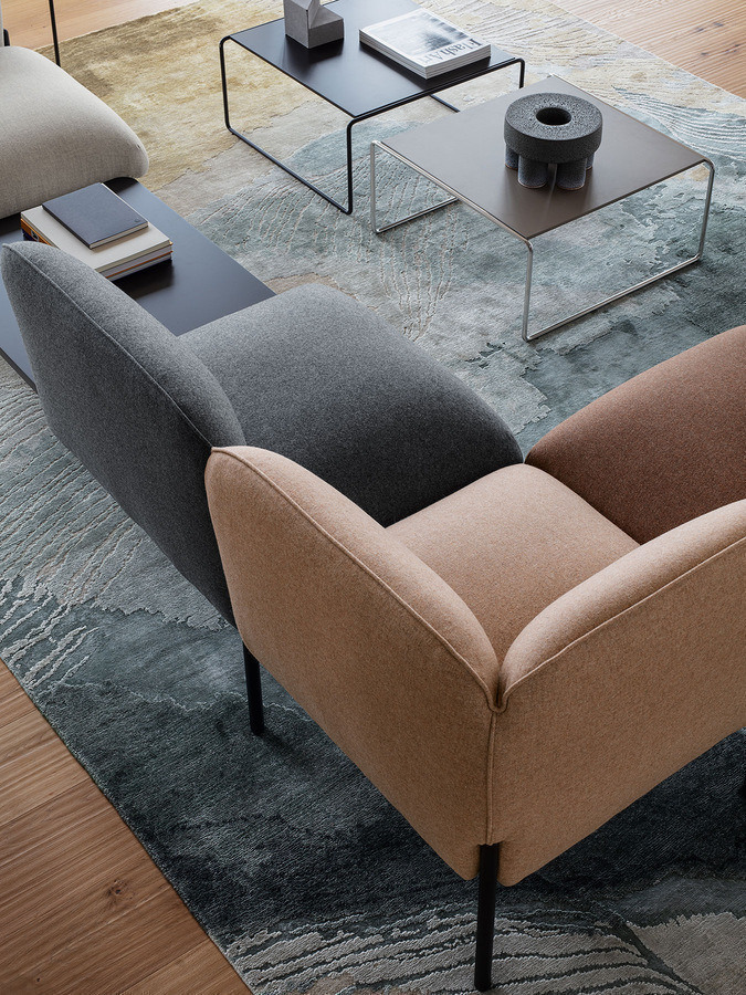 Frida by Matteo Zorzenoni is a modular system with soft, harmonious shapes, designed to create armchairs and small sofas. A tone-on-tone stitched cord outlines its silhouette, echoing the attention to detail typical of home upholstery. The metal legs—available in various colors—merge seamlessly into the armrests, enhancing the piece’s refined design.