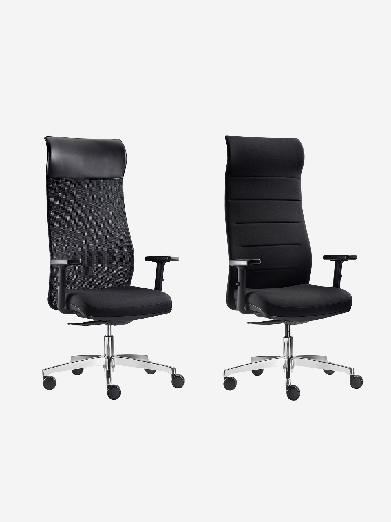 Self-weight synchronized executive chair with high backrest in mesh or fully upholstered, featuring height-adjustable lumbar support and height-adjustable armrests.
