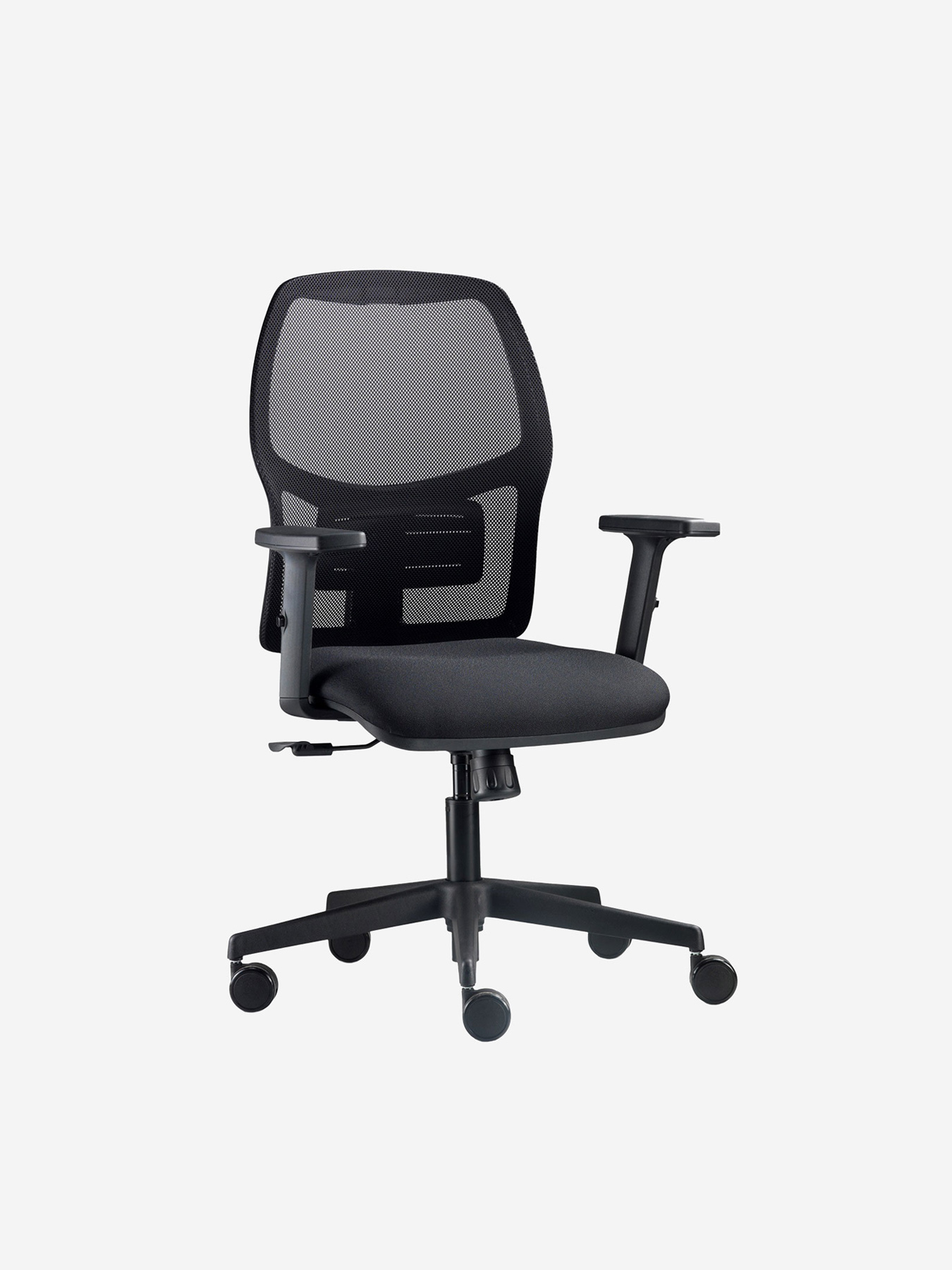 Mesh backrest with height adjustable lumbar support, polyurethane foam seat padding, synchro mechanism MS1BT, oversized self breaking castors