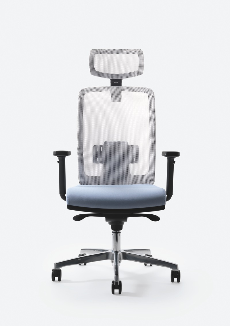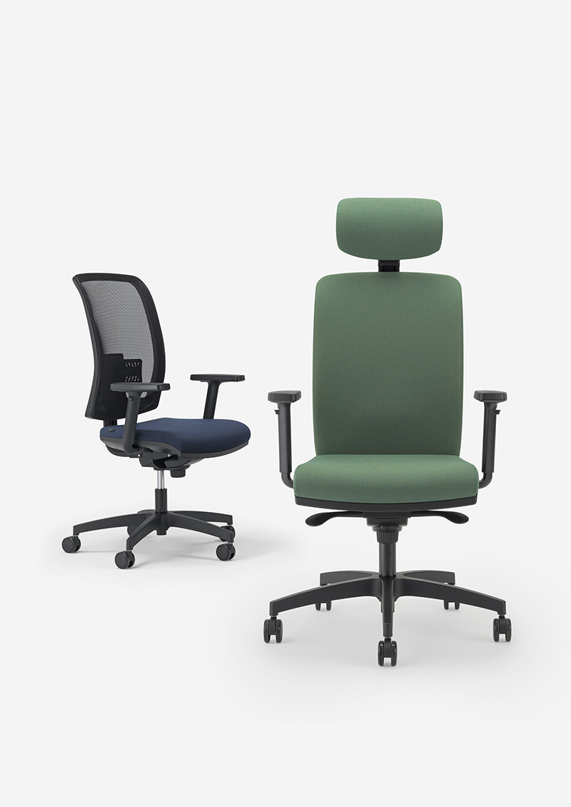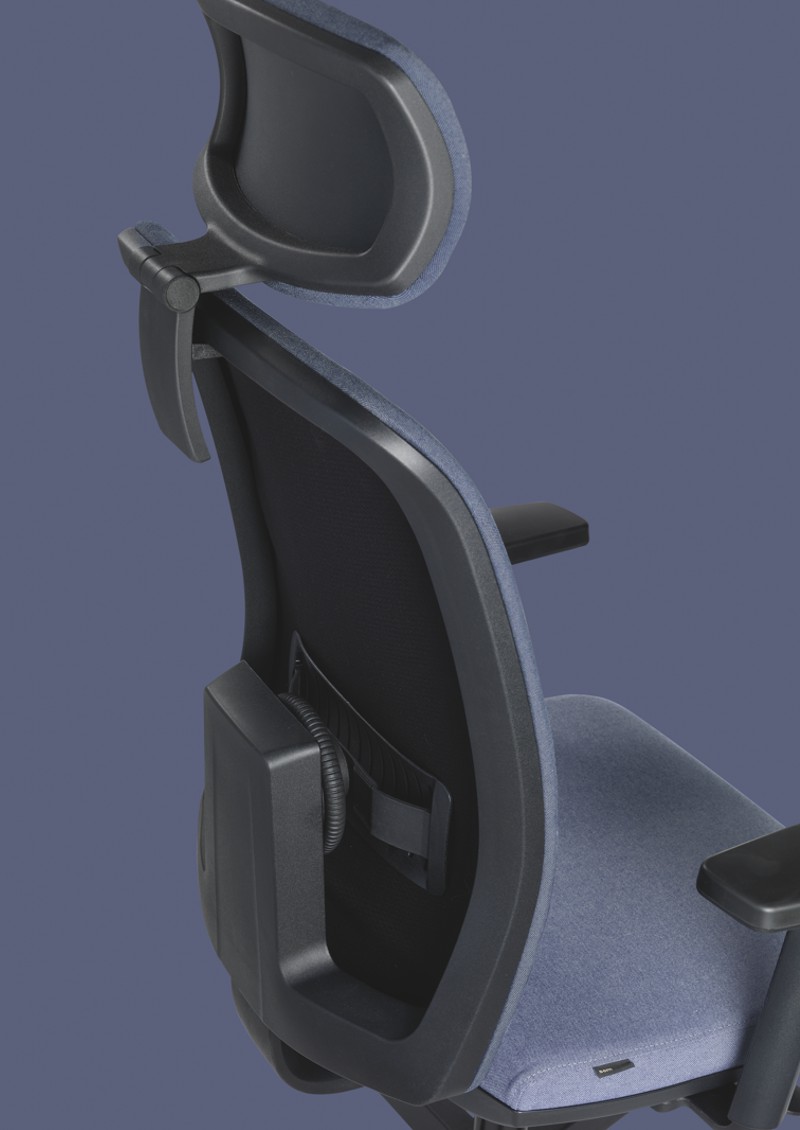 Chaise opérative ergonomique avec dossier réglable en hauteur et soutien lombaire réglable en hauteur et profondeur. Méchanisme synchrone. Disponible avec appui-tête et translation d’assise, avec ou sans accoudoirs ; dossier capitonné ou résille.