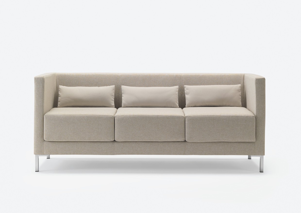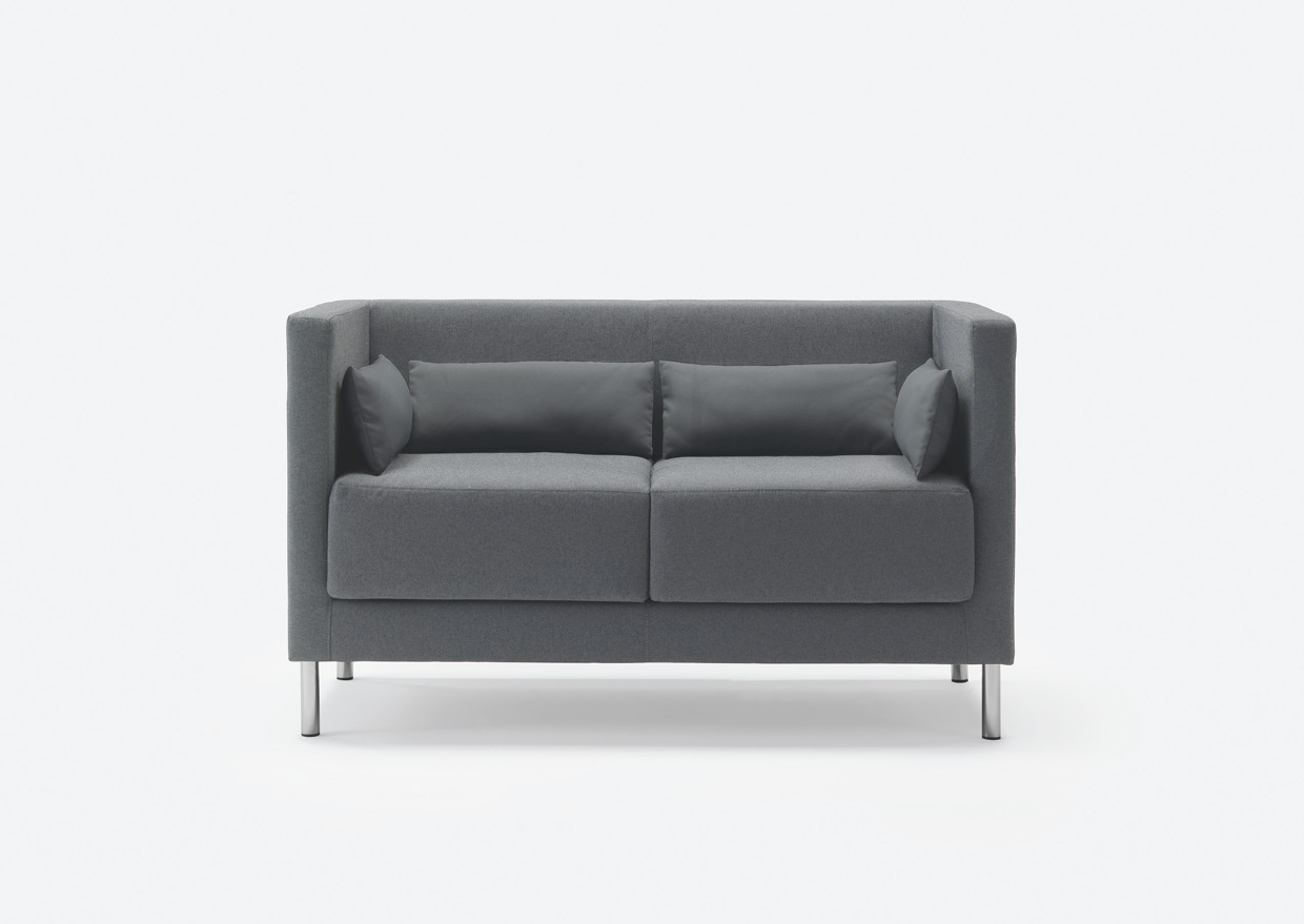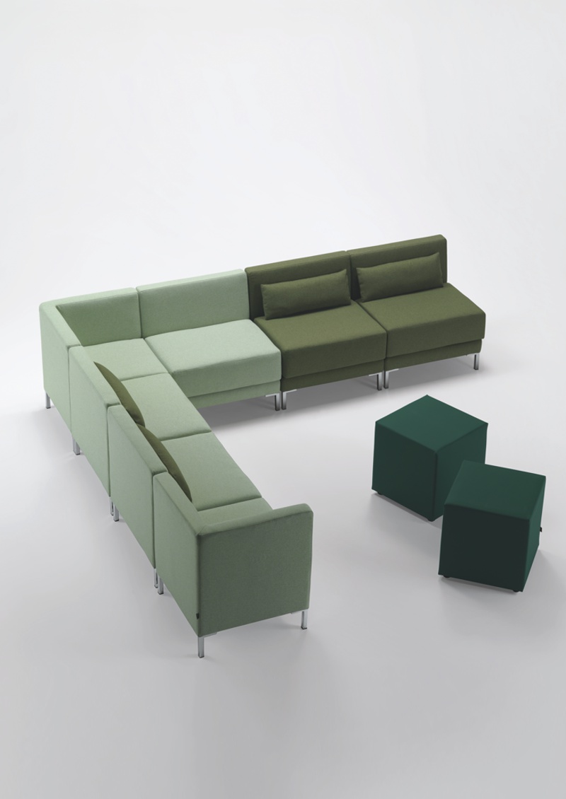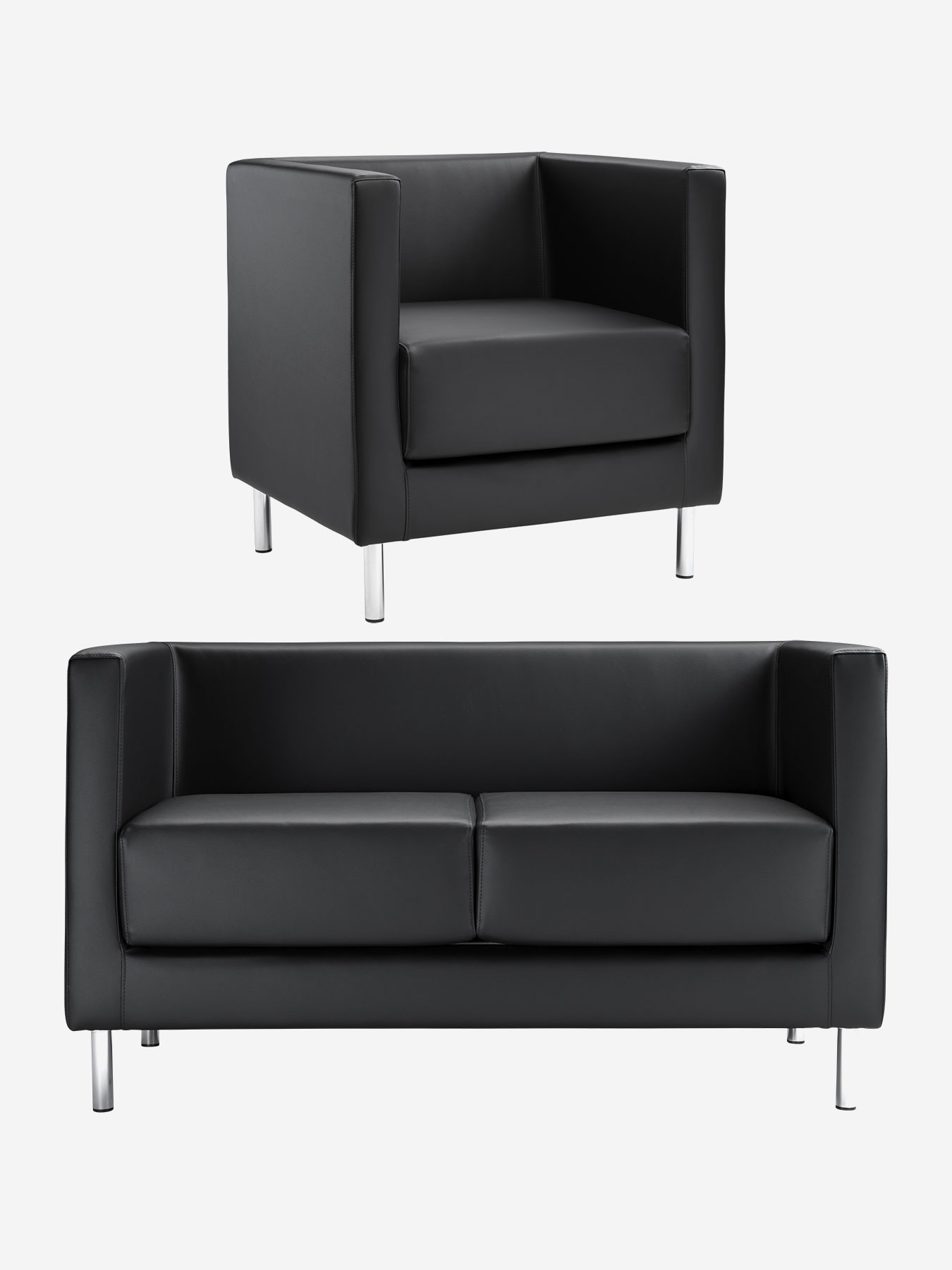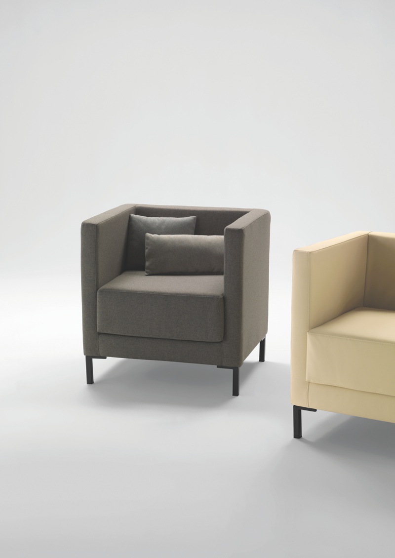 Chauffeuse et canapés aux formes carrées pour les salles d’attente, avec pieds ronds et angulaires, en finition chromé aussi bien qu’anthracite.