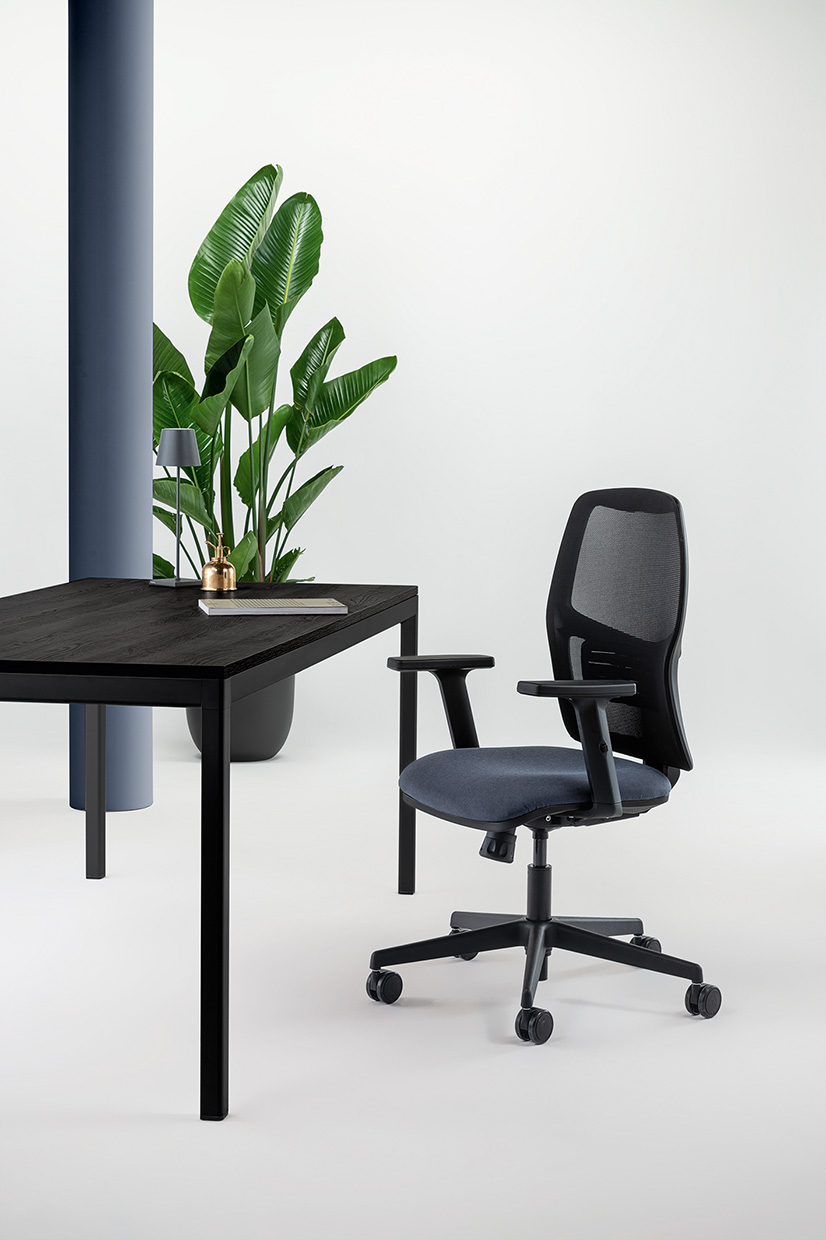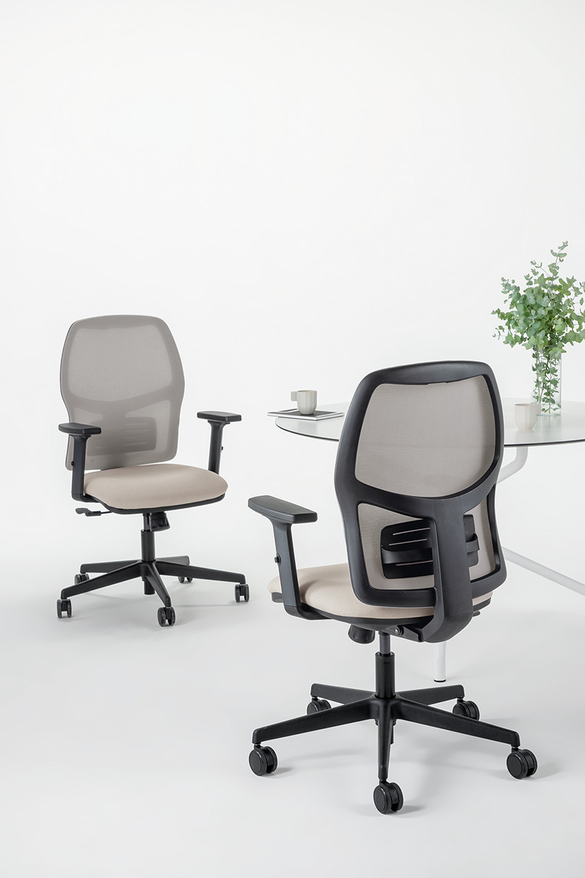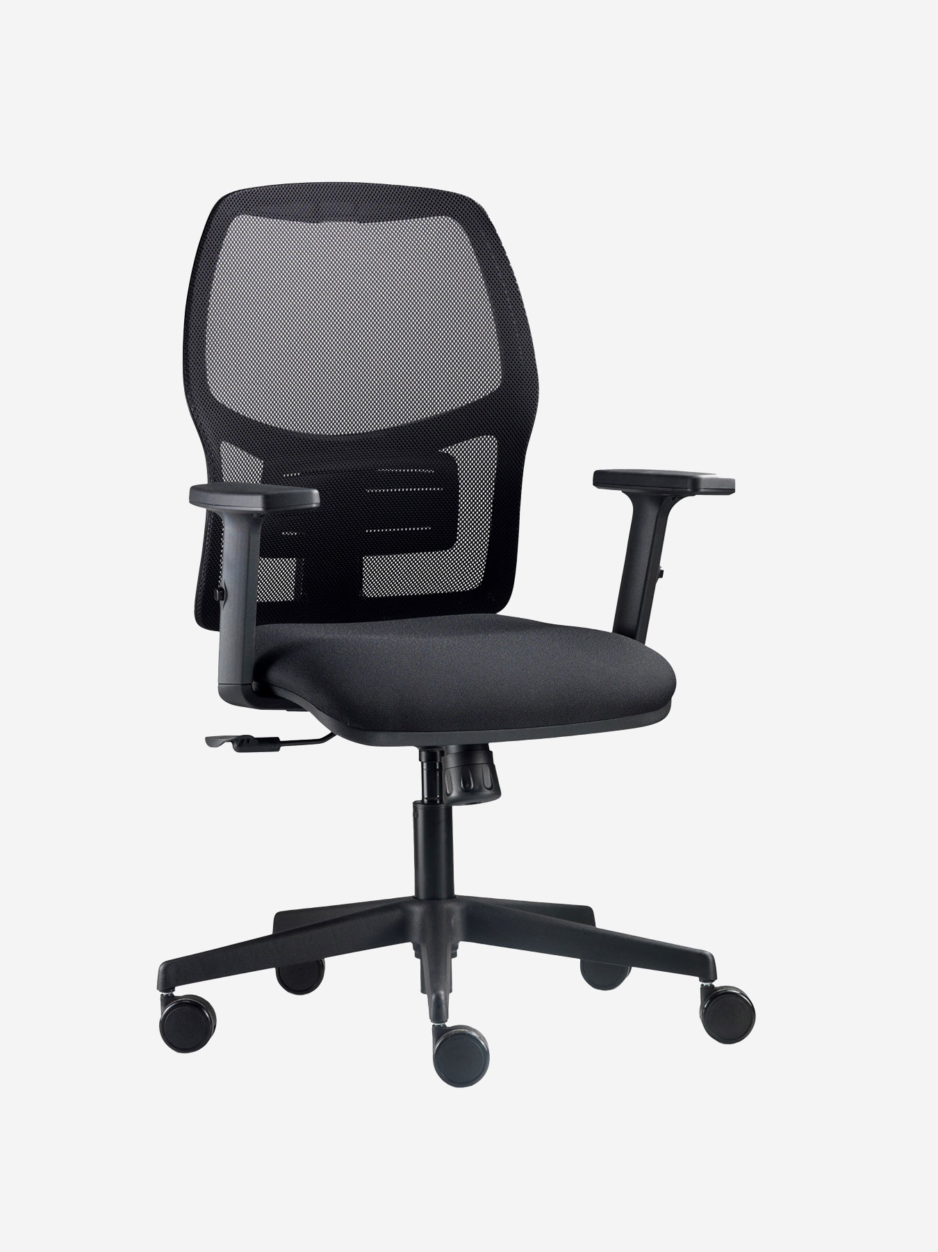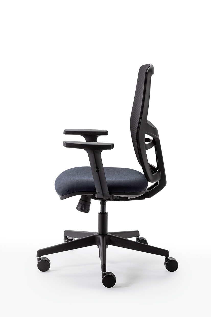 Dossier en résille RV avec support lombaire réglable en hauteur, assise rembourrée en mousse polyuréthane, mécanisme syncrone MS1BT, roulettes maxi auto-frenées