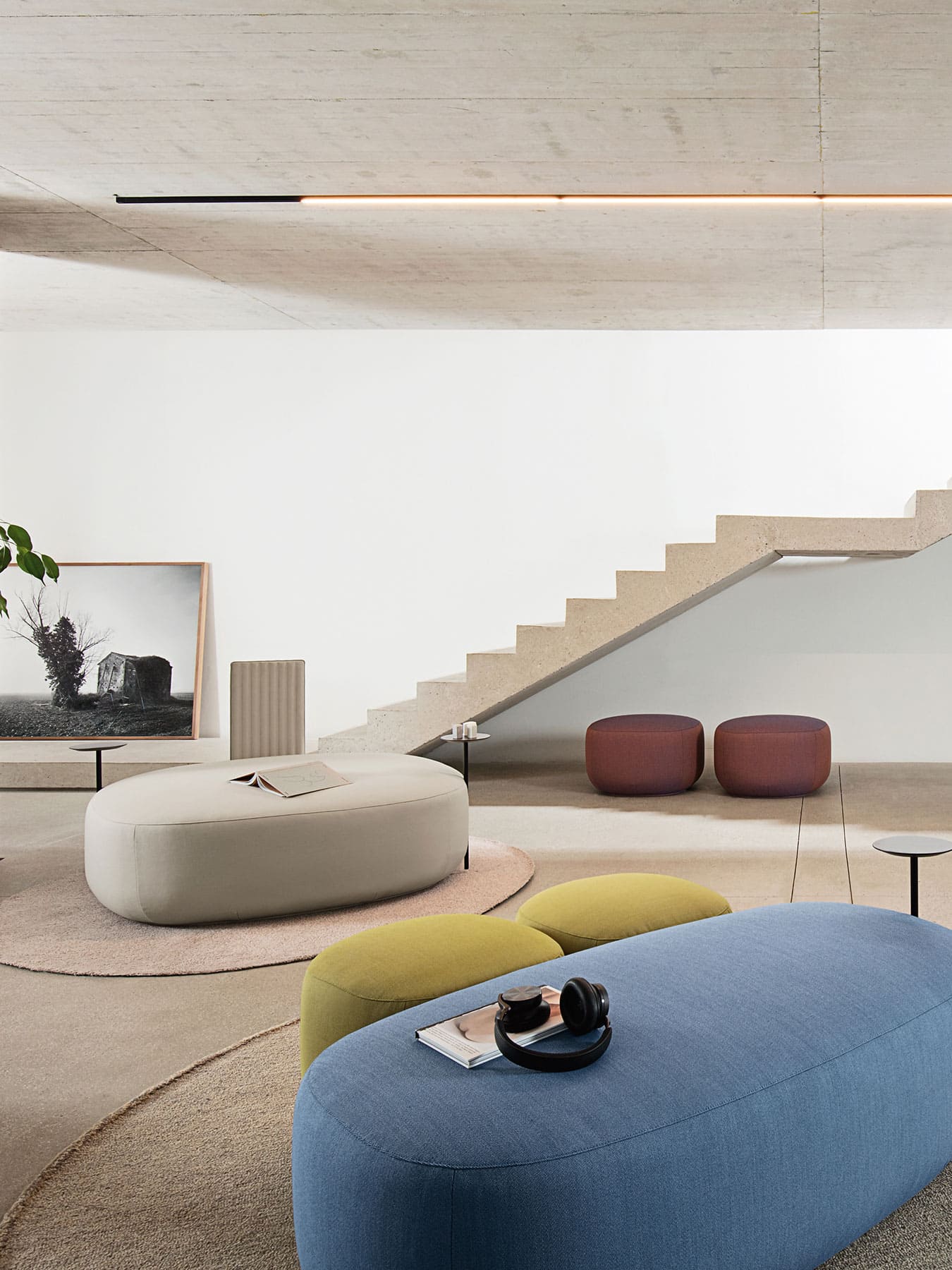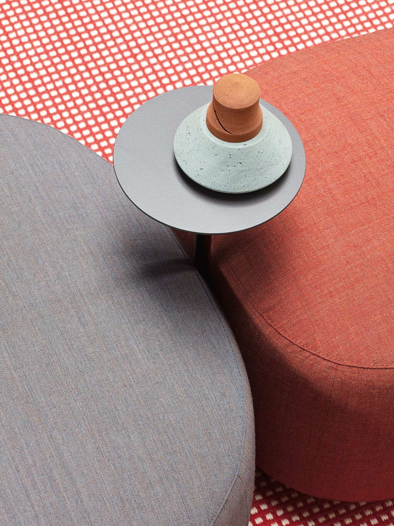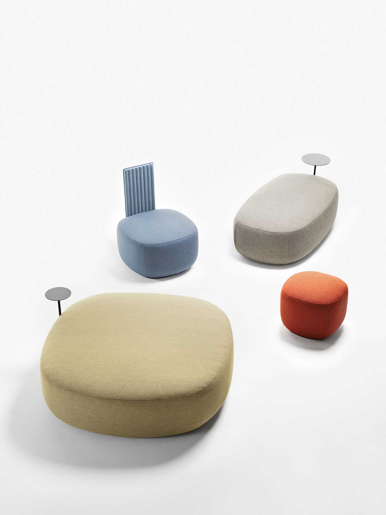 Bakku, design di Margherita Rui, è una collezione di pouf dalle forme organiche e dai volumi pieni. Declinati in quattro dimensioni, i pouf possono essere usati singolarmente o affiancati tra loro, per creare configurazioni di sedute informali. A completare la serie sono lo schienale ondulato, da applicare alla singola seduta o inserire tra due elementi, e il tavolino circolare.