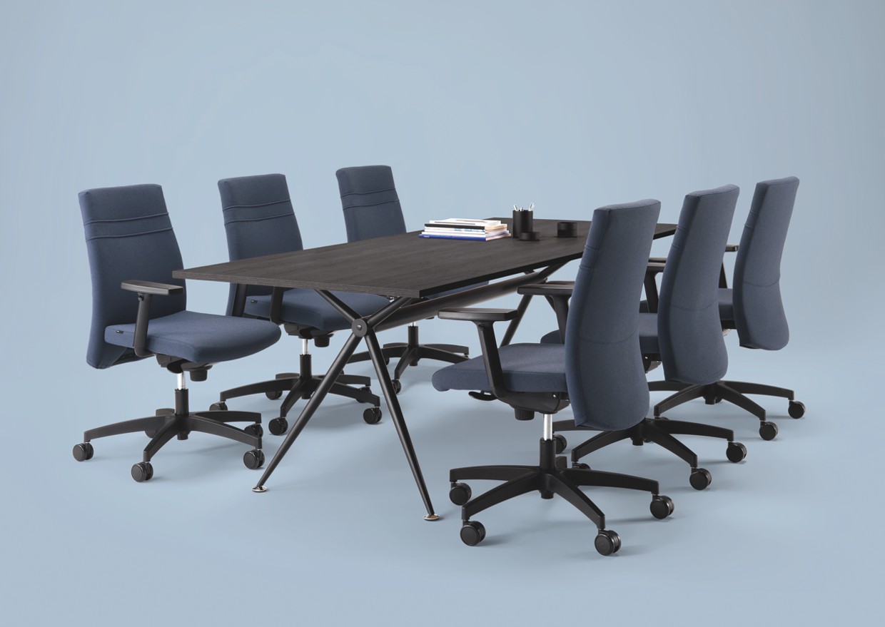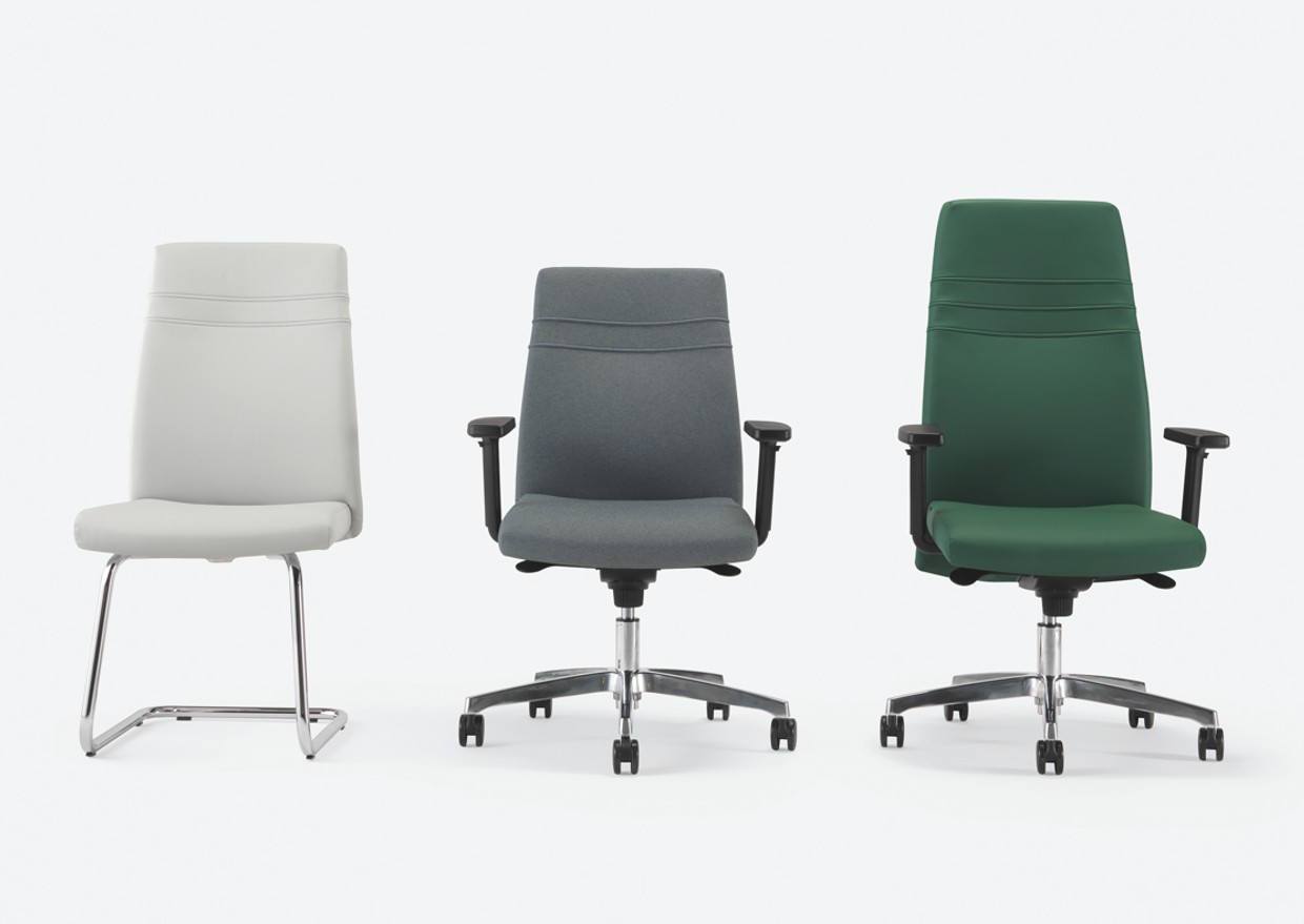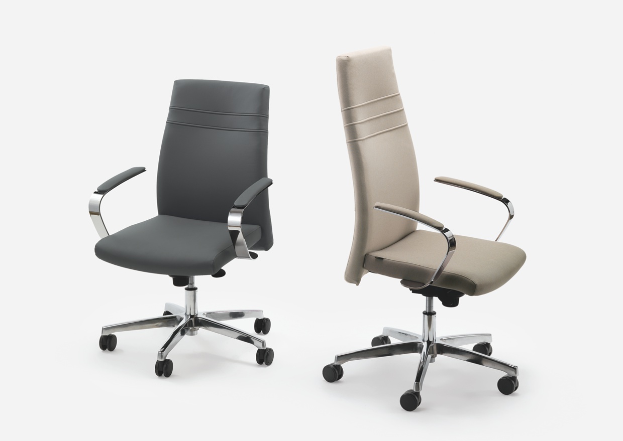 Serie di poltrone managerial sincronizzate eleganti e minimali, schienali regolabili in altezza, disponibili con braccioli cromati fissi o regolabili. Meccanismo syncro.